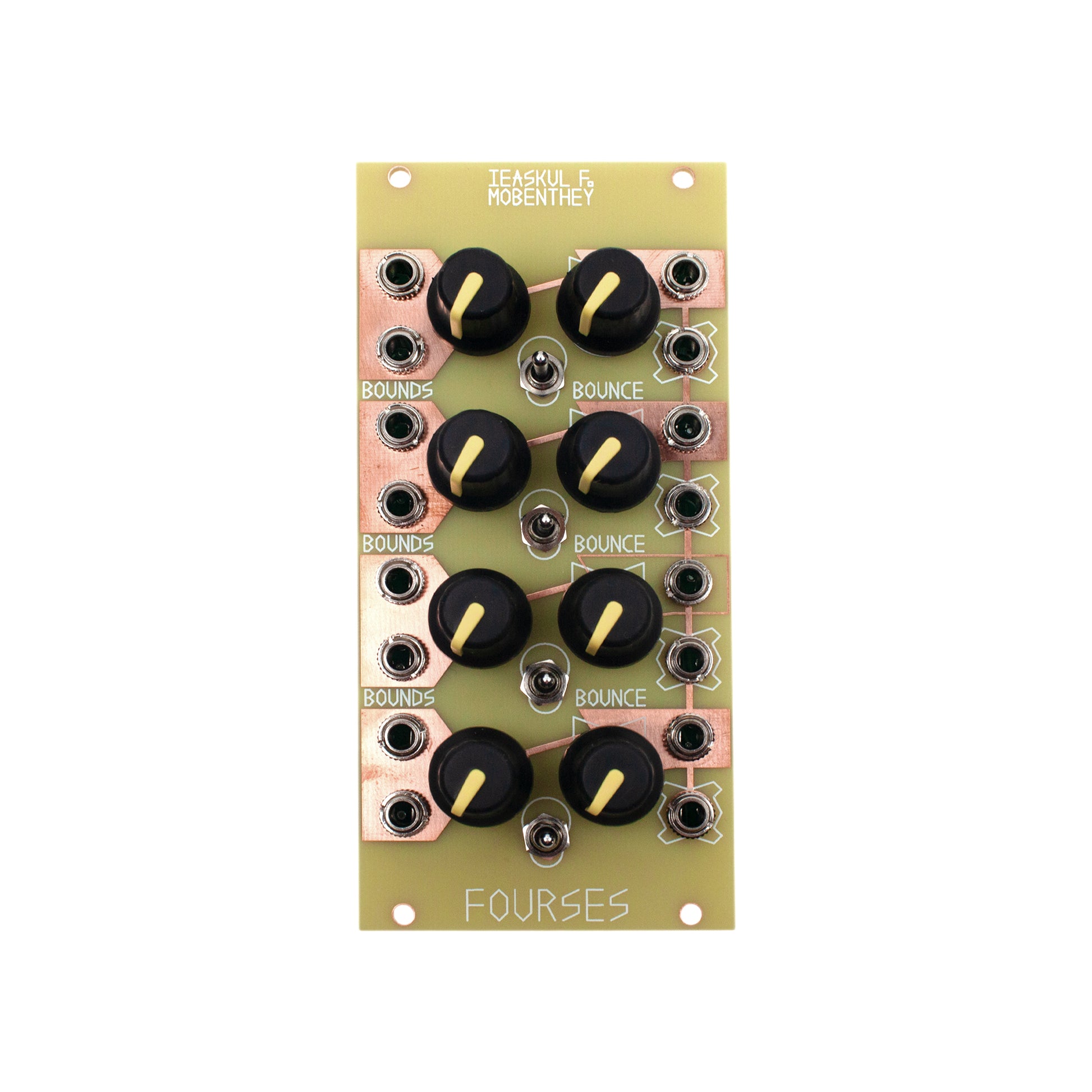 Looking at the front panel of Fourses, note that inputs are marked by copper fill. The four operators are exactly the same in appearance. The bounds of any operator are dictated by the ones immediately above and below, except for the very top and bottom operators; the top upper bound is set to eight volts, and the bottom lower bound to negative eight volts. The bounds of any operator, however, have inserts that you can use to manually set a boundary to whatever voltage you wish. This may introduce Ieaskul's masthead, the paradox wave, that comes about when a lower bound is greater than an upper bound, causing the oscillator to go into hyper oscillation since it cannot rest in any stable zone.